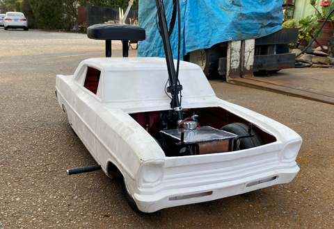 This is our 1966 Nova Hot Rod go kart with a killer stance. Features include a square tube chassis, 6.5hp engine (electric option available), hydraulic disc brake and aluminum racing wheels. This little hot rod has wheelie bars and plenty of power to use them too. These novelty go karts are growing in popularity around car shows, racing events, swap meets or just as conversation pieces in the man cave. We are now working with a paint shop and have options for custom paint jobs. If interested please contact us at sales@affordablegokarts.com to discuss order details.