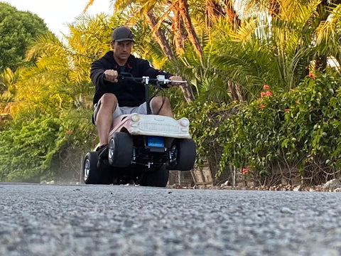 We put a 55 Chevy fiberglass body over a square tube, tig welded chassis with a 6.5hp engine (electric option available), solid rear axle, hydraulic disc brake, aluminum rims, racing tires and other go kart components to come up with this unique mini hot rod. Other features include a torque converter, wheelie bars and custom exhaust. These novelty go karts are growing in popularity around car shows, racing events, swap meets or just as conversation pieces in the man cave. We are now working with a paint shop and have options for custom paint jobs. If interested please contact us at sales@affordablegokarts.com to discuss order details.